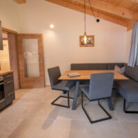 Es gibt eine geräumige Küche incl. Eckbank und Esstisch sowie ein Wohnzimmer mit gemütlicher Eckcouch und Smart-TV.